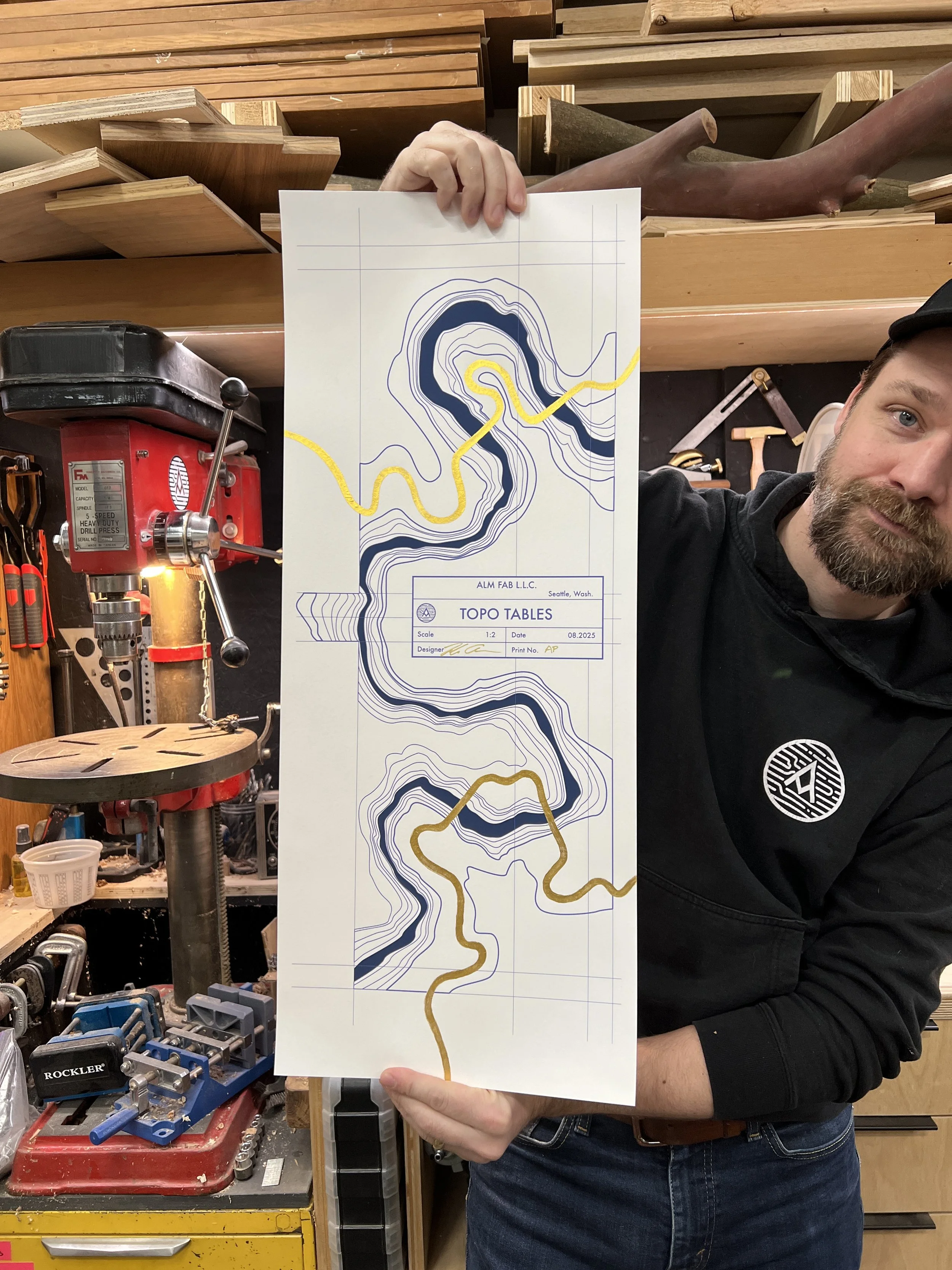 Inspired by the topography used to create the Topo Tables. This limited edition Topo Table Fine Art Print is an archival Giclèe Print with deep navy contour lines reminiscent of a blueprint.